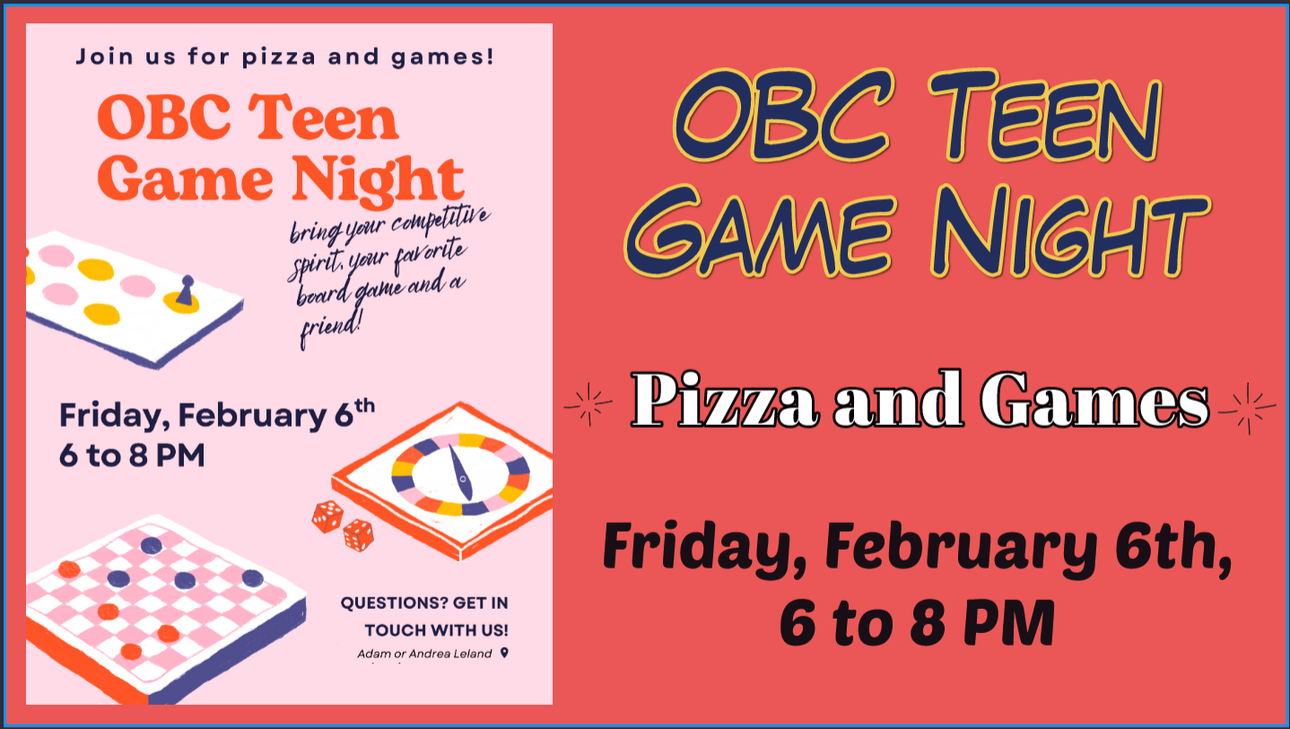 Join us for a fun evening of pizza and games at OBC Teen Game Night! Bring your competitive spirit, your favorite board game, and a friend. This is a great opportunity for teens to relax, connect, and enjoy fellowship together.